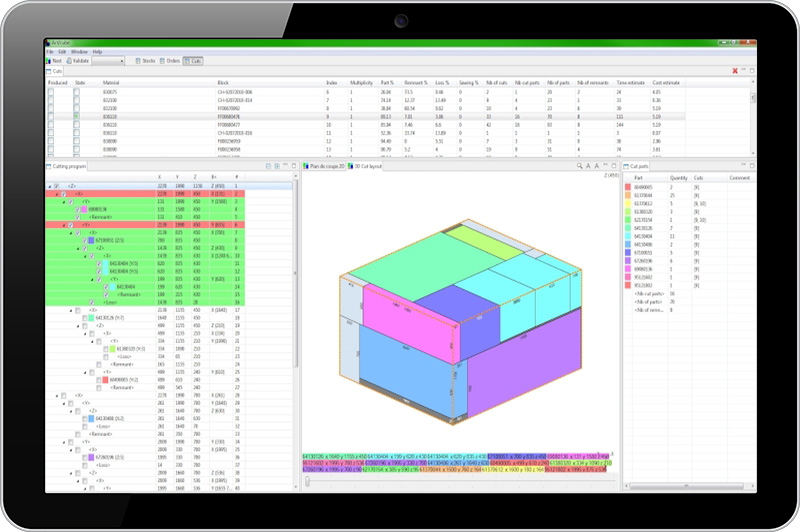 almaCube permite realizar rápidamente ensamblajes muy compactos, gracias a un verdadero nesting en 3D y no un simple apilado de capas. El software optimiza la materia, no solamente dentro de un bloque, pero también de manera global (selección de los mejores bloques a utilizar). Gestiona las tolerancias para suprimir cortes superfluos en los materiales que llevan demasiado tiempo de corte y gran cantidad de consumo de energía. El tiempo de cálculo de la optimización puede ser configurado por el usuario. AlmaCube puede re-utilizar los retales y manejar cantidades opcionales de piezas. Además, el software puede acoplarse a un sistema GPAO o ERP para importar archivos (formatos y cantidades) con posibilidad de personalización. almaCube es muy simple de utilización y produce planos de corte borde con borde adaptados a las funcionalidades de las máquinas y a las distintas tecnologías de corte (hilo, cuchilla, sierra, etc.). Los resultados del nesting pueden exportarse automáticamente en formato .csv; además, la ficha taller con la descripción del programa de corte puede personalizarse de acuerdo a las necesidades del cliente.