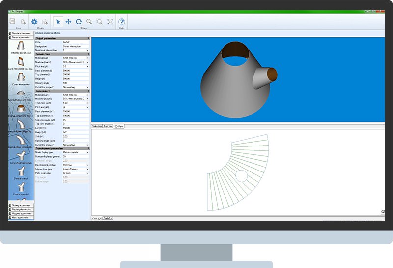 Various shapes and assemblies sorted by categories (circular, conical, oblong, rectangular, rounded rectangular, hoppers, elbows, branches…).