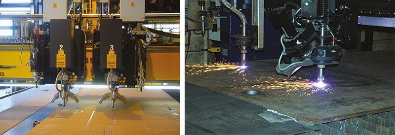 In the shipbuilding business it is also necessary to have the capacity to manage machines that produce chamfers, and to manage the associated operations (multi-passes, height verification, reconfiguration loops, etc.) as well as specific marking units. In particular these operations make it possible to trace all kinds of texts which are used for assembling or welding the parts.