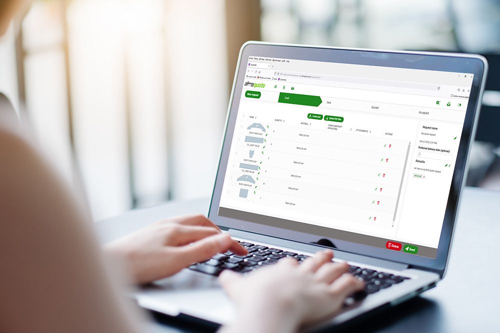Através de uma interface web muito fácil de utilizar, o cliente final pode facilmente fazer o download das peças ao orçar no formato DXF ou mesmo definir geometrias simples, para em seguida associar a cada peça uma quantidade, um material e eventuais operações complementares.