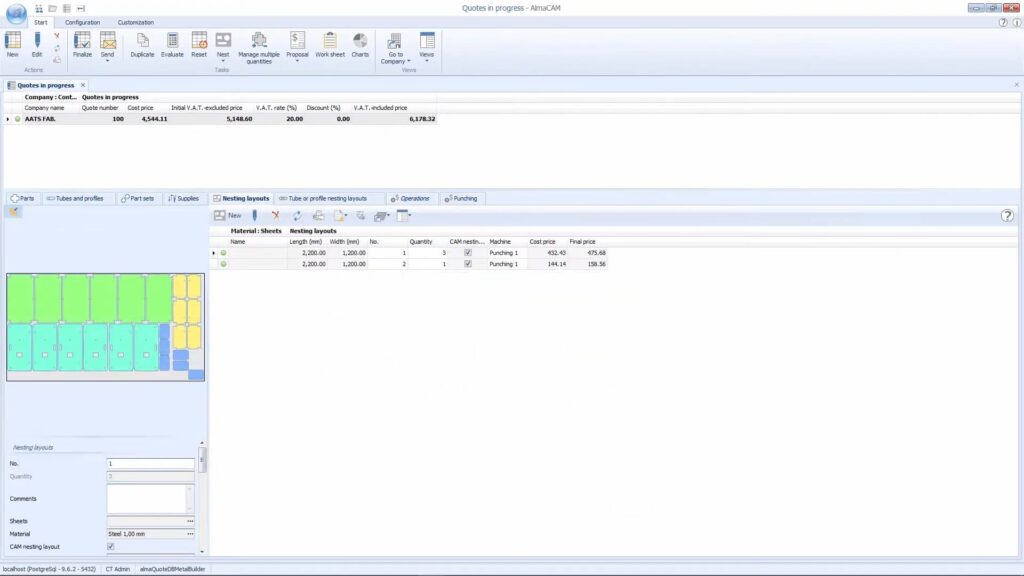 Almaquote enables you to quickly create a quote using a few characteristics of the part to cut or to very precisely calculate the cost of the operations required to manufacture and deliver a part. In this case, for 2D parts, the geometry can be designed or defined by a DXF or DPR file or from a predefined shape. For tubes or sections the part can be imported from a 3D CAD/CAM file. It is possible to calculate the cost of single parts, sets of parts, or even 3D assemblies, using the Assembly2cam module.